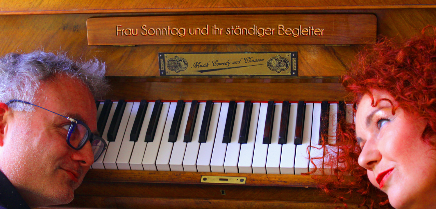 Das Eheleben auf der Bühne geht mittlerweile in die 5. Runde mit nicht wenig ironischen Untertönen, aber immer charmant, witzig und vor allem voll musikalisch. Zwischen Frau Sonntag und ihrem ständigen Begleiter gibt es eine klare Rollenverteilung: Als Rasseweib mit roter langer Mähne und einer Stimme, die von hauchzart bis deftig derb variiert, singt und instrumentiert Frau Sonntag über die Bühne.